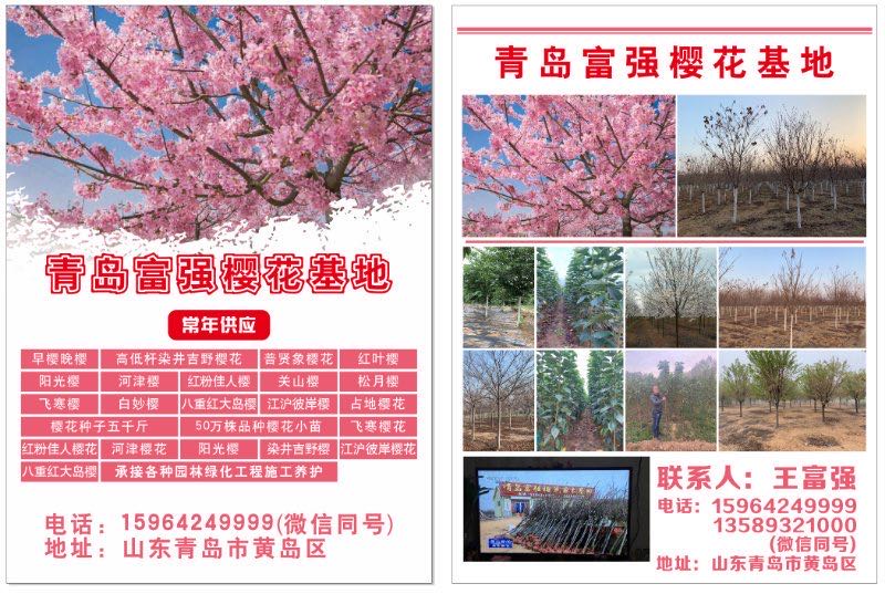 山東青島富強(qiáng)櫻花苗木基地歡迎您(王富強(qiáng) 13780680000、13589321000),青島富強(qiáng)品種櫻花基地常年供應(yīng):早櫻晚櫻,高低桿染井吉野櫻花,陽(yáng)光櫻,河津櫻,紅粉佳人櫻,關(guān)山櫻,大漁櫻,松月櫻,飛寒櫻,白妙櫻,美利堅(jiān)櫻,紅花染井吉野櫻,八重紅大島櫻,江滬彼岸櫻,小松乙女櫻,思川櫻,紅山櫻,雅櫻,獎(jiǎng)?wù)聶,八重紅垂枝櫻等占地櫻花,承接各種園林綠化工程施工養(yǎng)護(hù)。歡迎新老客戶來(lái)我們這邊考察,購(gòu)苗買(mǎi)苗服務(wù)。